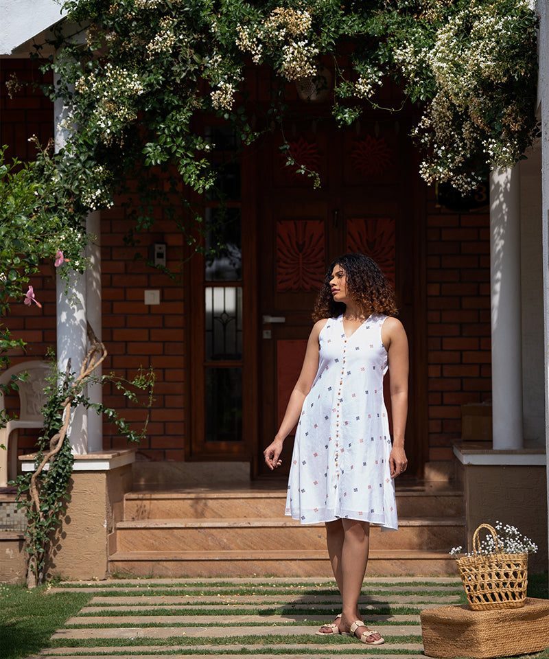 Crafted from premium Ikat fabric, it boasts a timeless charm. The sleeveless design features a gentle V-neckline and a flattering A-line silhouette that gracefully skims the body. Delicate floral motifs in soft hues adorn this exquisite piece, lightweight and breathable, it’s an ideal choice for warm weather occasions or casual daytime outings.