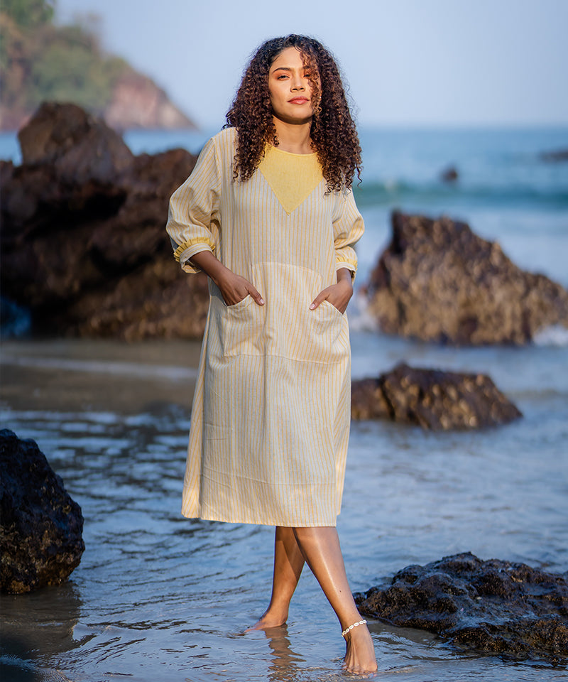 We offer sustainable clothing. They are either naturally dyed, handwoven or handspun garments. The unconventional variation on the fabric are a novel way of expressing our style of fabric and not a defect as such.