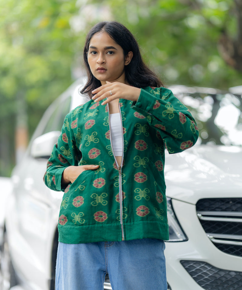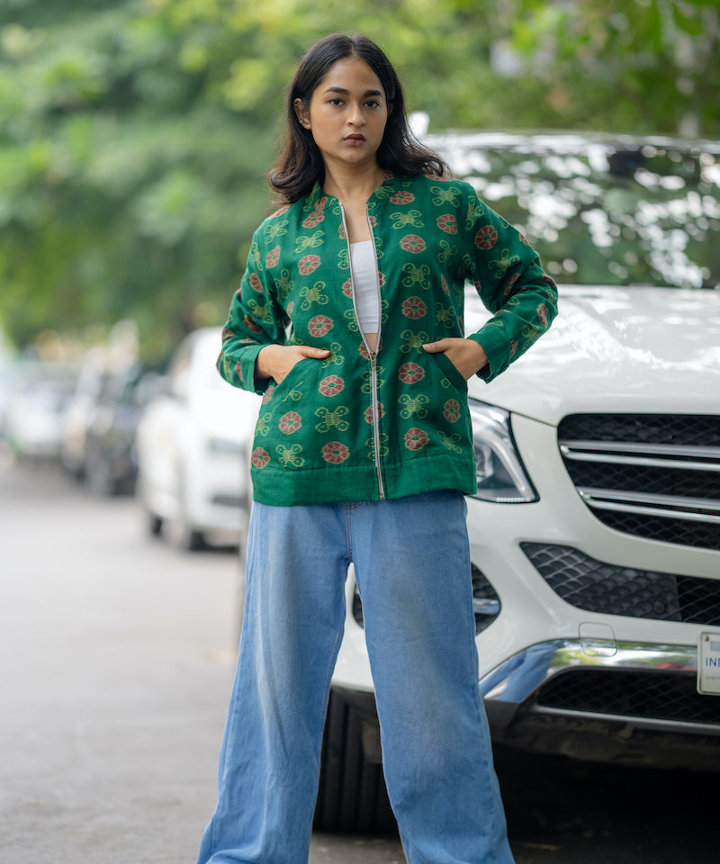 This bomber jacket that is a symbolic beauty of the premium handwoven Ikat cotton of Odisha.
