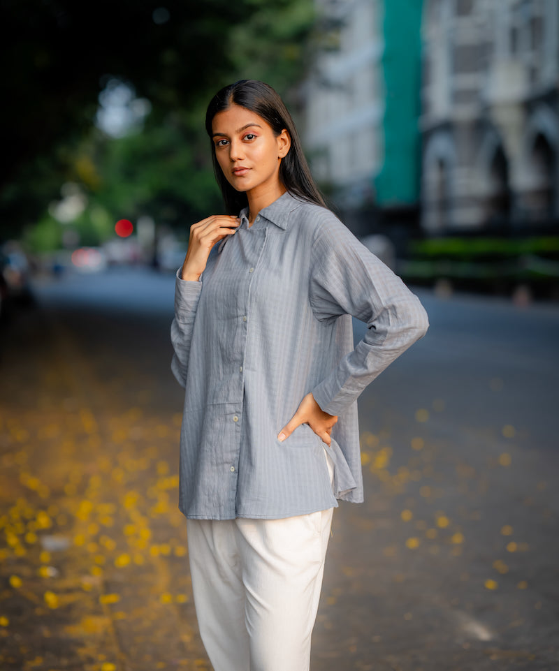 Tailored for a flattering fit, this shirt features a timeless grey palette with subtle tonal variations, full-length sleeves, and a sharp pointed collar. Its delicate topstitching and curved hemline add a chic touch, making it a versatile piece for both formal and casual ensembles.
