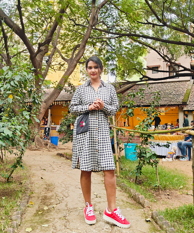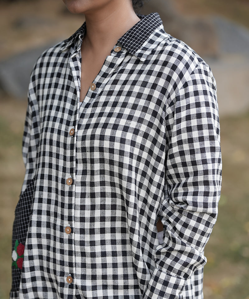 Its intricate hand embroidery adds a touch of artisanal craftsmanship, creating an ethereal charm that is hard to resist. The classic black and white checkered pattern exudes a rustic yet contemporary vibe. Perfect for those who appreciate the blend of tradition and modern fashion.