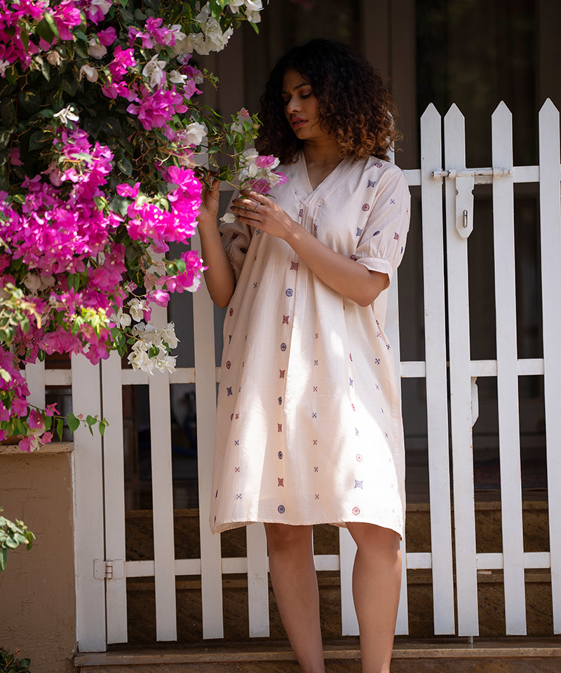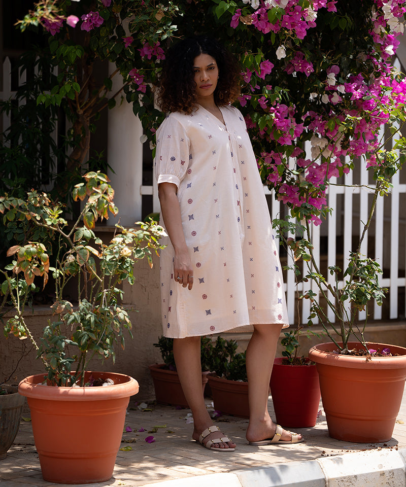 This elegant handloom dress features a timeless design. The dress presents a relaxed silhouette with short sleeves and a comfortable knee-length cut, making it perfect for both casual and semi-formal occasions. Adorned with subtle, delicate embroidery that adds a touch of artisanal charm.