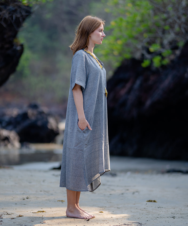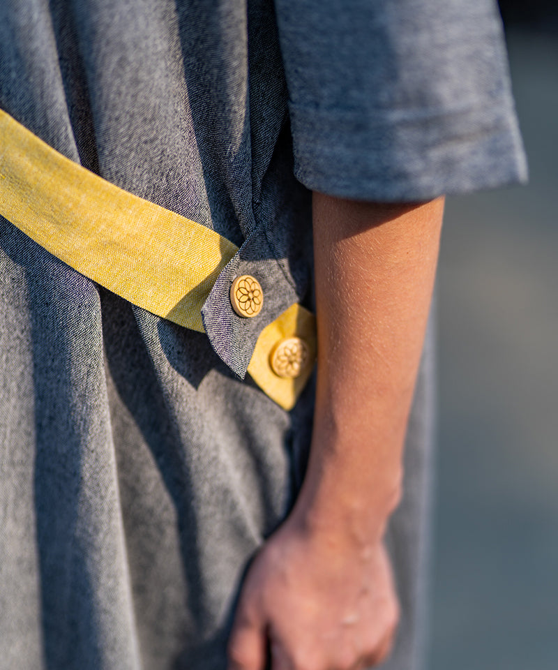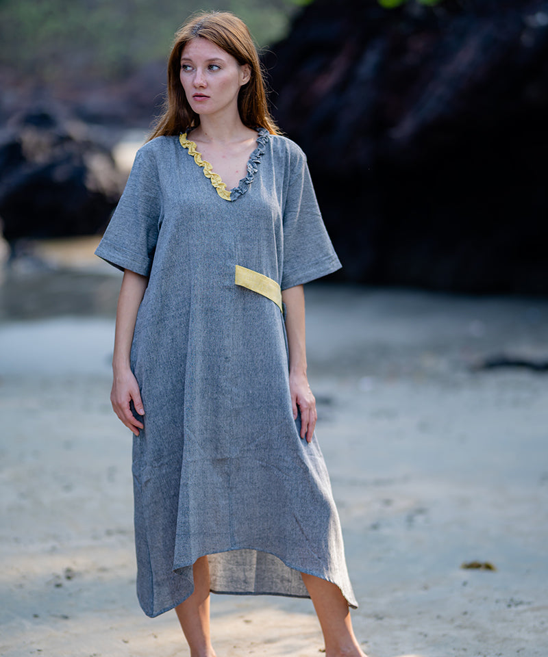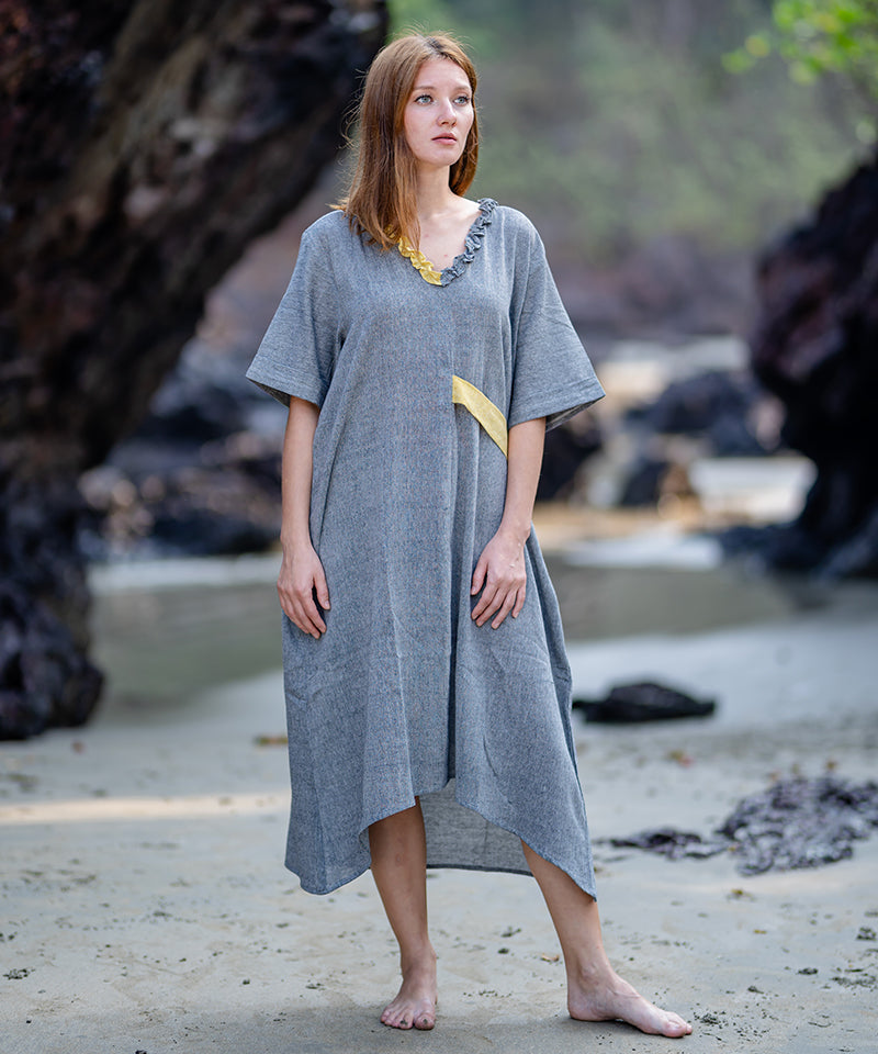 We offer sustainable clothing. They are either naturally dyed, handwoven or handspun garments. The unconventional variation on the fabric are a novel way of expressing our style of fabric and not a defect as such.
