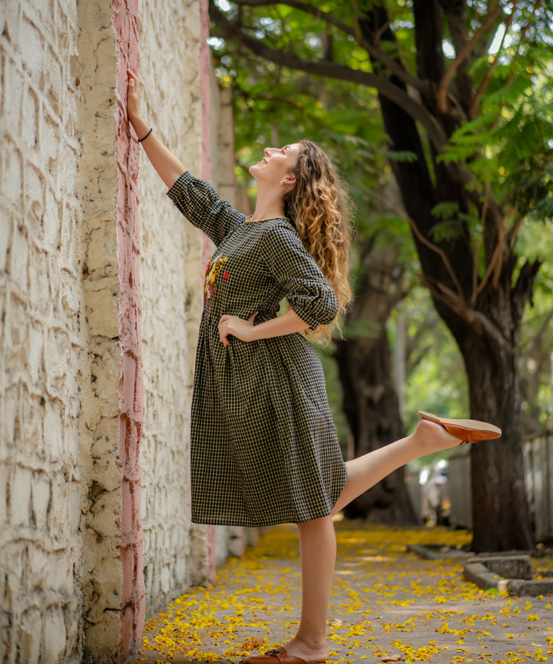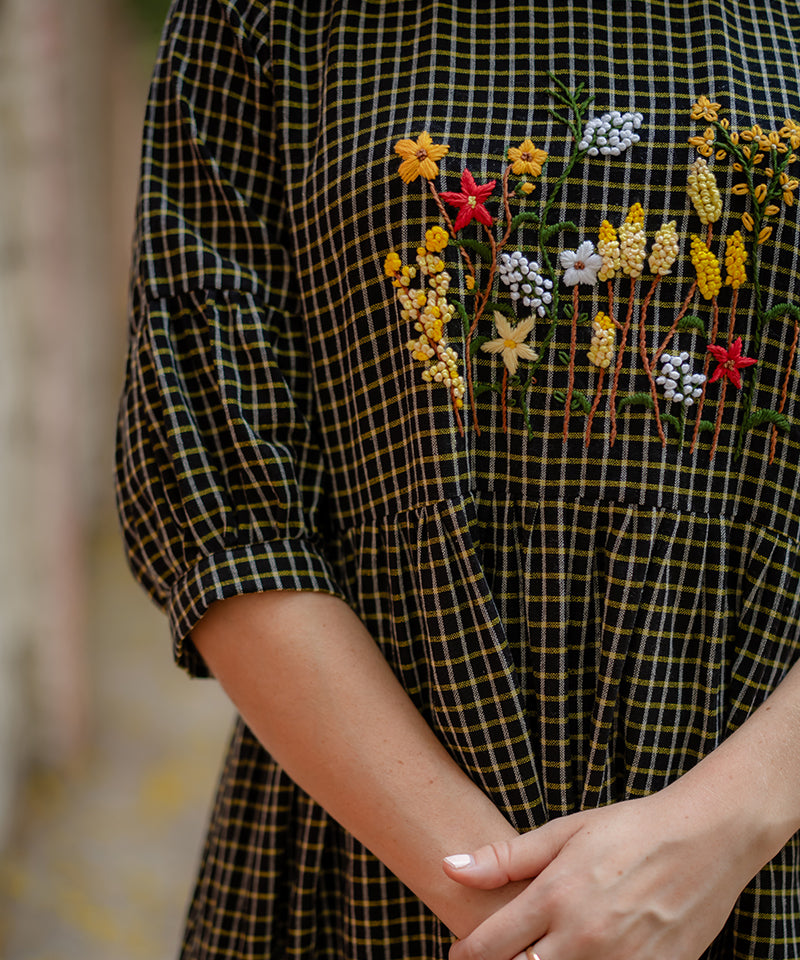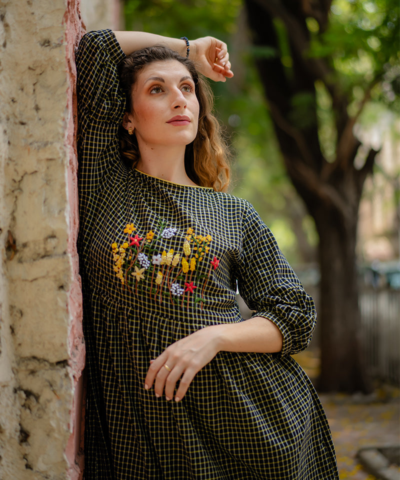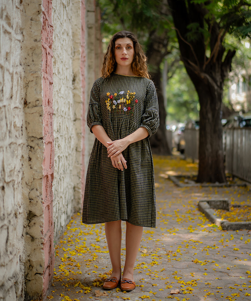 The black and white checkered pattern offers a timeless look, while the vibrant floral embroidery adds a modern twist. With a mid-length cut, relaxed fit, and three-quarter sleeves, it’s perfect for those who seek comfort with a touch of elegance. Ideal for various occasions, this dress is a testament to effortless sophistication.